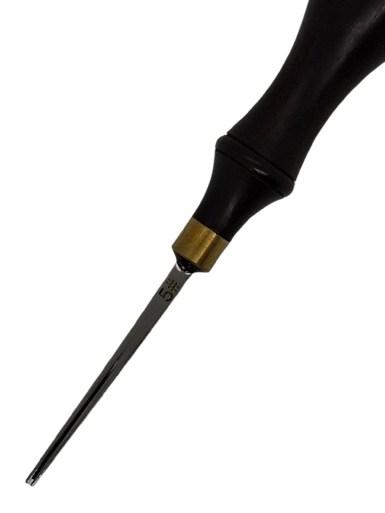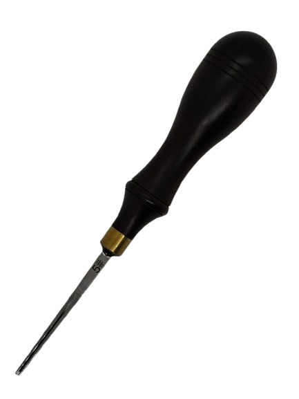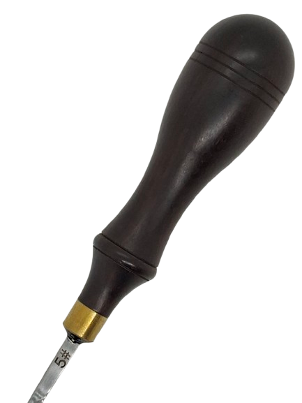 Det ergonomiskt utformade trähandtaget ger ett stabilt och bekvämt grepp som gör det möjligt att arbeta kontrollerat även i tuffare material. Den noggrant slipade ståldelen skär effektivt bort mer material och formar en tydlig, jämn avrundning längs lädrets kant. Mässingsringen mellan handtag och blad förstärker konstruktionen och ger en gedigen kvalitetskänsla.